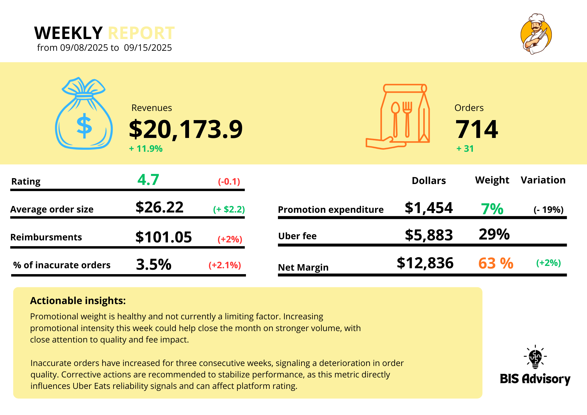 BIS Advisory provides ongoing performance intelligence, designed specifically for restaurants operating on Uber Eats.